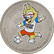 Ну а для массового обращения были выпущены три монеты из недрагоценных металлов, у каждой из которых небольшая часть тиража (250 тысяч штук) выполнена в цвете. На них изображены эмблема, кубок и талисман чемпионата. Забивака вышел особенно хорошо.