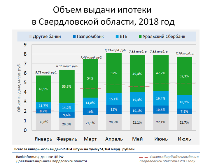 По итогам 7 месяцев 2018 года выдачи ипотеки в Свердловской области приросли на 78%. Это меньше, чем по итогам первого полугодия (83%): резкий рост спроса на ипотеку начался во втором полугодии 2017 года, поэтому база сравнения увеличивается из месяца в месяц, и чем дальше, тем ниже будет процент прироста. Особенно это станет заметно со следующего месяца - цифра резко упадёт.