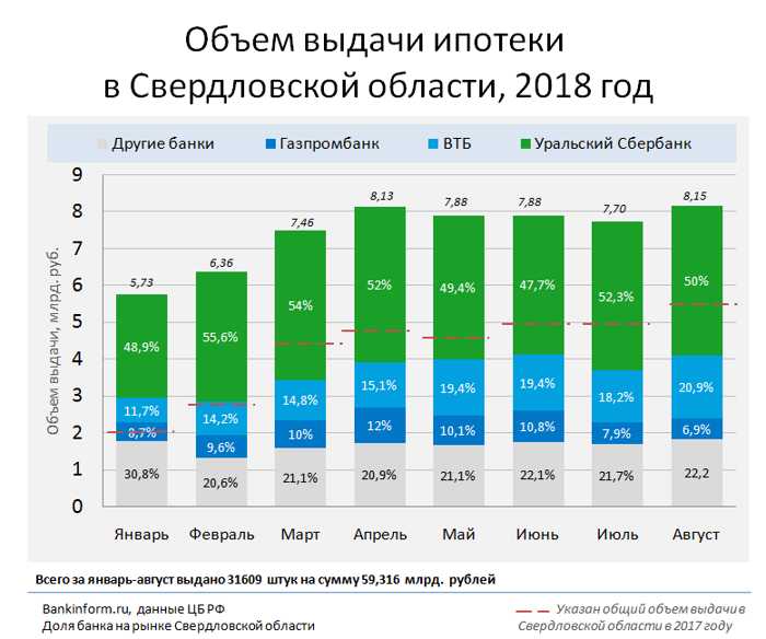 Согласно последним данным ЦБ РФ, в августе 2018 года российские банки выдали 126 тыс. ипотечных ссуд на общую сумму в 260 млрд рублей. Накопленный с начала года итог превысил 900 тыс. кредитов и 1,8 трлн рублей.