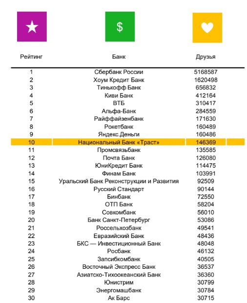 В рейтинге учитывается общее число подписчиков банков в соцсетях Твиттер, Фейсбук, ВКонтакте и Одноклассники.