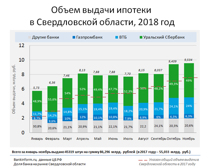На инфографике представлена динамика ипотечного рынка Свердловской области с указанием доли крупнейших игроков. В ноябре они практически не изменились.