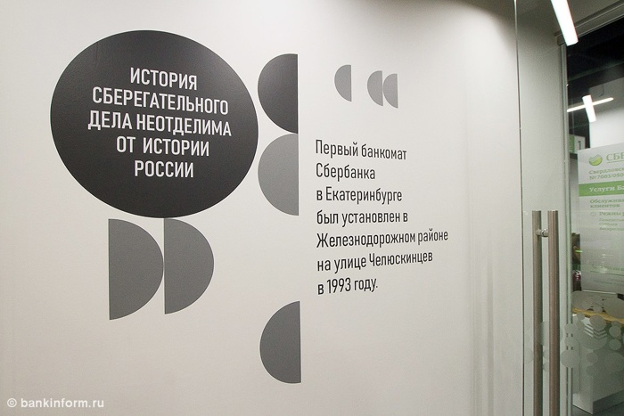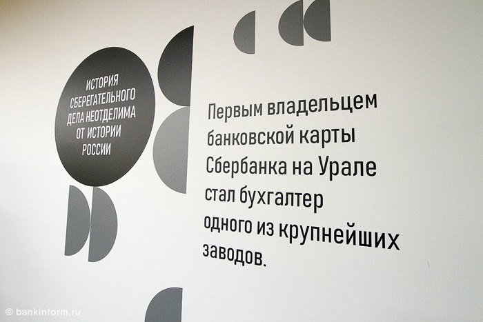 Сбербанк России открыл в Екатеринбурге необычный офис. Расположенный в Ельцин Центре, он сам стилизован под экспозицию музея первого президента России. Причём как внешне, так и по содержанию. Дизайн выполнен в характерных для Ельцин Центра чёрно-серо-белых тонах, «сбербанковского» зелёного здесь минимум, даже вывеска над входом потеряла яркость. На стенах - ещё одна отсылка к музею - можно прочесть факты из истории Сбербанка 90-х годов. Например, такой.