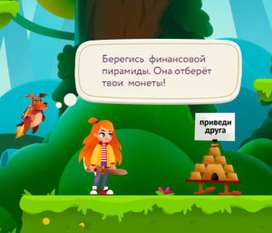 Спросите, где же тут финансовая грамотность? О, её хватает. На протяжении всей игры персонаж собирает монеты и теряет их при столкновении с мошенниками. Мошенники почему-то по большей части еноты, но встречается и парочка человекоподобных негодяев. Енот-мошенник