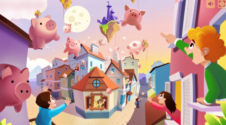 По сравнению с «Муравьишкой», всё ещё обитающим где-то в недрах центробанковского сайта (да, на сайте ЦБ есть игра, вы не знали?), «Тайна потерянной копилки» - поистине выход на новый уровень. Здесь есть сюжет и недурная анимация, в начале, в конце и в межуровневых паузах игроку показывают короткие мультики, складывающиеся в полноценную историю. Если коротко: злой волшебник и по совместительству копилочный вор ограбил двоих детей, заодно прихватив одного из них. Оставшемуся (в зависимости от выбранного персонажа это девочка Полина или мальчик Ваня) нужно спасти брата (сестру) и семейные сбережения. В этом герою способствует любимый питомец - говорящая и передвигающаяся на реактивном ранце собака Ракета (привет «Стражам Галактики»!). Собака страшненькая, толстенькая (сразу отпадает вопрос, зачем ей реактивный ранец), но очень полезная - именно она станет финансовым советником героя, а в конце и вовсе окажется незаменимой.