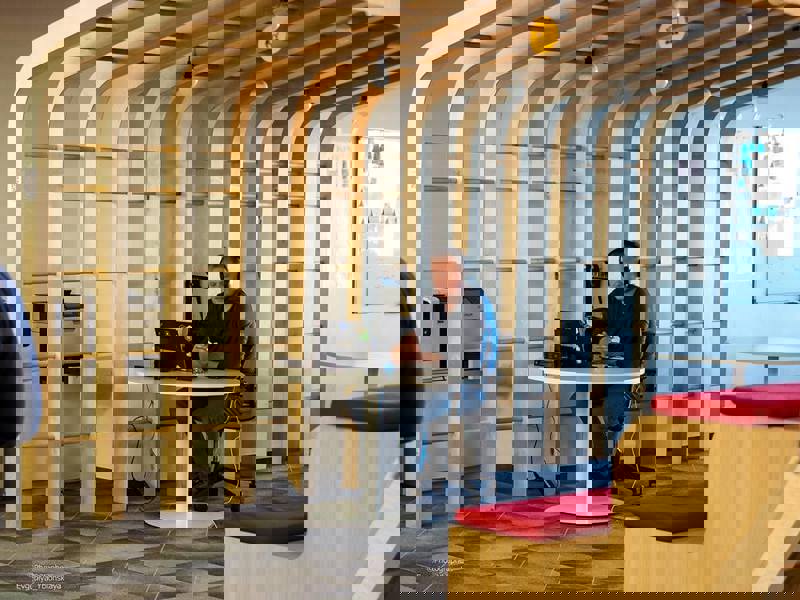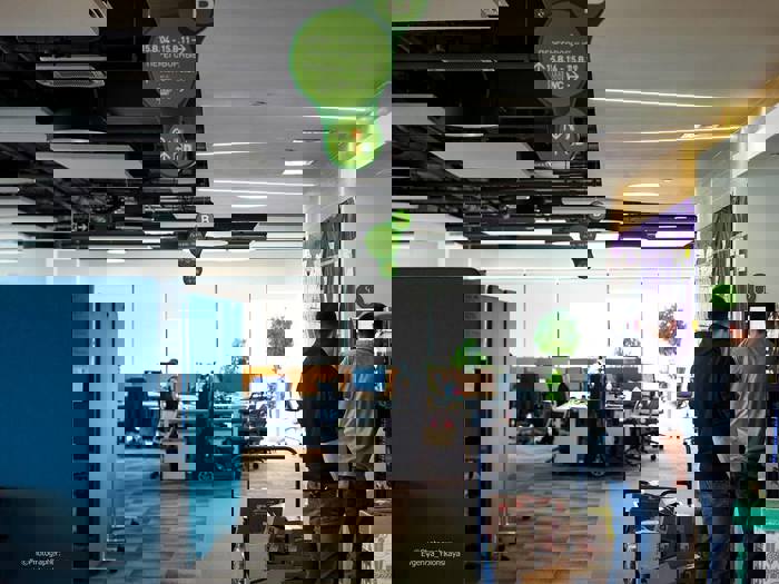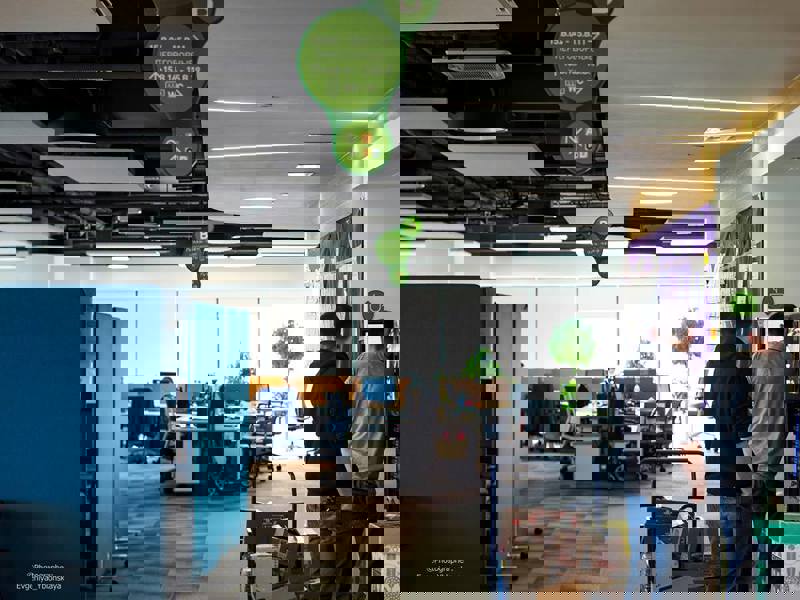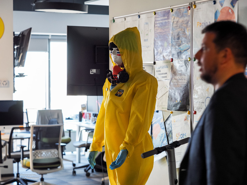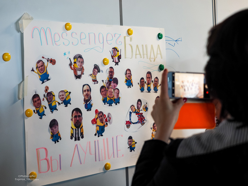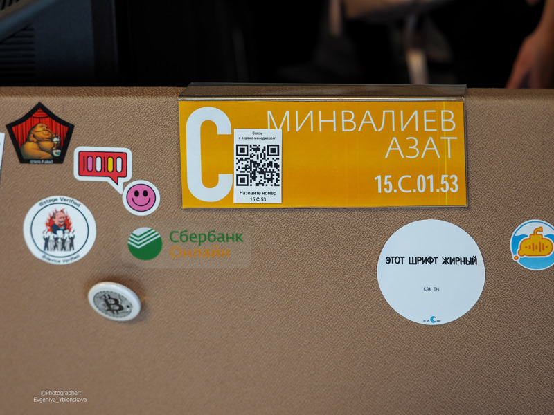 Так, 15-й этаж разделён на несколько частей, связанных кольцевой дорогой. В центре размещены комнаты для переговоров c забавными названиями, зоны отдыха, два больших зала для проведения презентаций. Рабочие места расположены по внешней стороне кольца и разделены перегородками. Это зона цифрового трайба. Именно здесь "живёт" Сбербанк Онлайн во всех своих вариантах. Обойдя по кругу весь этаж, мы познакомились с некоторыми командами.