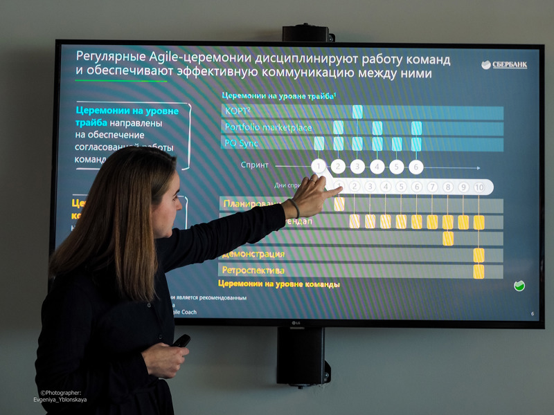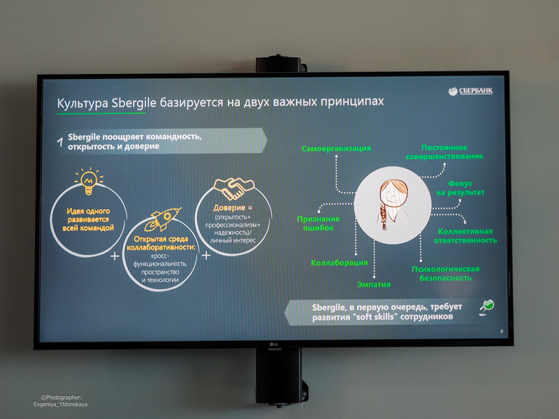 Вкратце история такова. В 2016 году Сбербанк начал переводить разработку цифровых продуктов на принципиально новую модель - Agile. Agile подразумевает, что люди, занимающиеся проектом на разных этапах - разработчики, тестировщики, продажники - ранее друг друга в глаза не видавшие, должны работать вместе, сопровождая проект от этапа чистой идеи до выхода на рынок. На практике это здорово ускоряет разработку продуктов. И трудятся они все вместе именно здесь, в Agile Home, открытом в 2017 году.