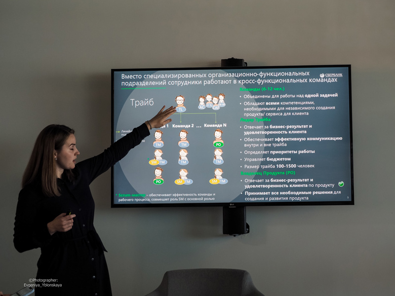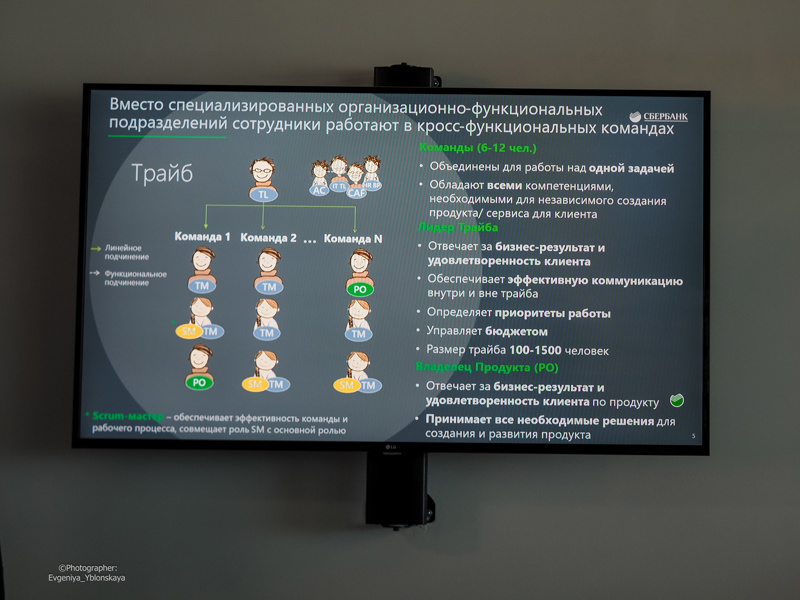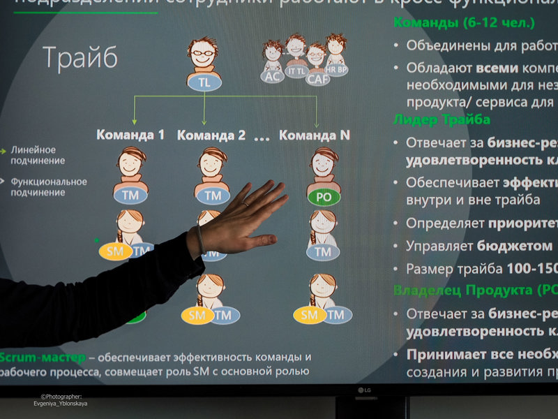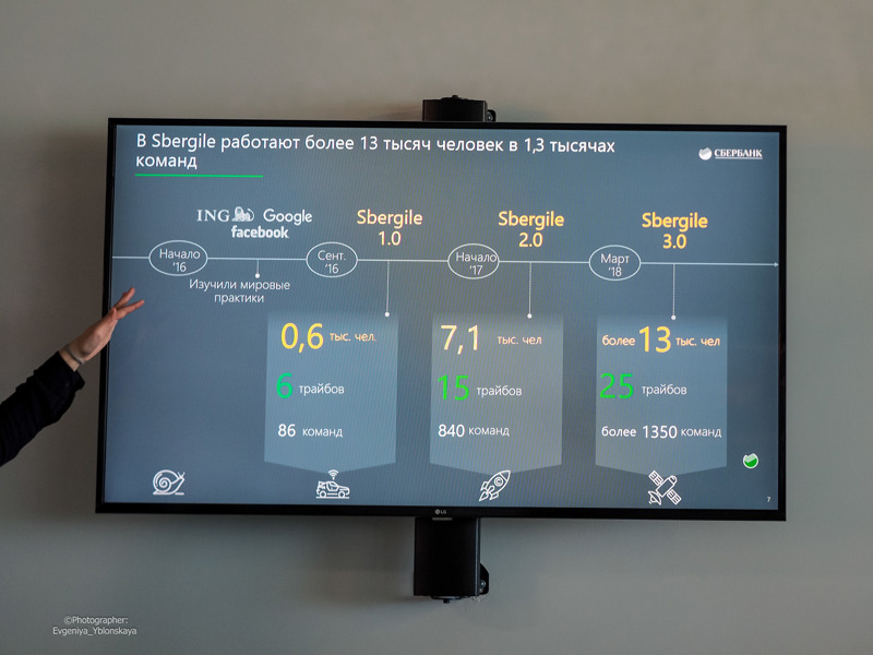 «Местное население» (а это более 13 тысяч человек) чётко структурировано. Согласно базовым принципам модели Agile, офис состоит из подразделений - так называемых трайбов (в Сбербанке любят английские слова), каждый из которых отвечает за собственный блок продуктов. В трайб входят несколько команд (скводов) по 6-12 человек, и каждая из них обладает всеми компетенциями для автономного создания конкретного продукта или сервиса, чем собственно и занимается. На апрель 2019 года в Sbergile действует 25 трайбов и более 1300 команд.