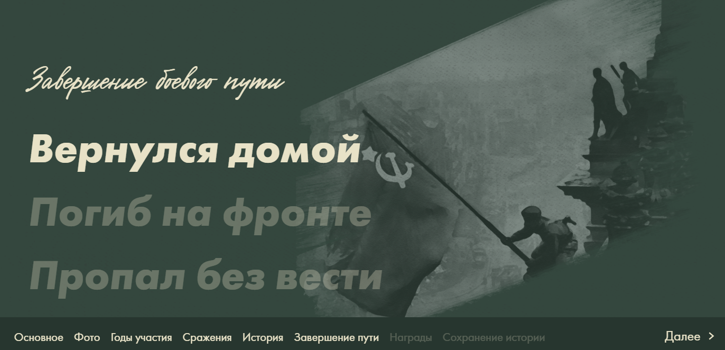Затем в Банк памяти добавляется сохранившаяся информация о ветеране - фотография, звание, род войск, пройденные сражения и операции, полученные награды. В специальное поле «История» при желании можно добавить любые другие сведения.