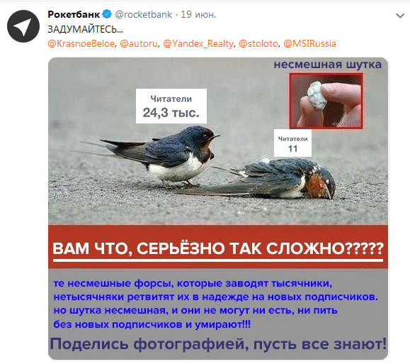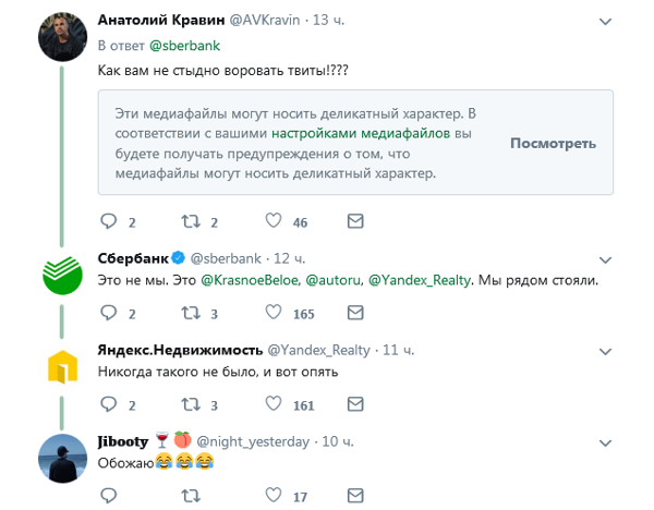 Некоторые пользователи не поверили, что этот твит Сбербанка и предложили перелогиниться Рокетбанку. Тот ответил, что на «вчерашние шутки» он шутит только со своего аккаунта, пожурив бренды за такие мемы накануне: