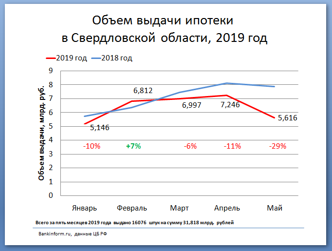В Свердловской области динамика намного хуже, и показатели текущего года однозначно уступают цифрам 2018-го. Такой тренд задал январь, когда по стране наблюдался рост рынка в годовом выражении, а в Свердловской области - падение. За январь-май в регионе выдано 16076 кредитов на 31,8 млрд рублей, что на 10,6% меньше прошлогоднего показателя.