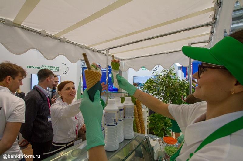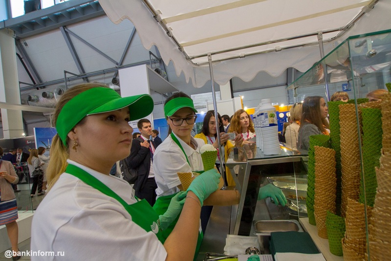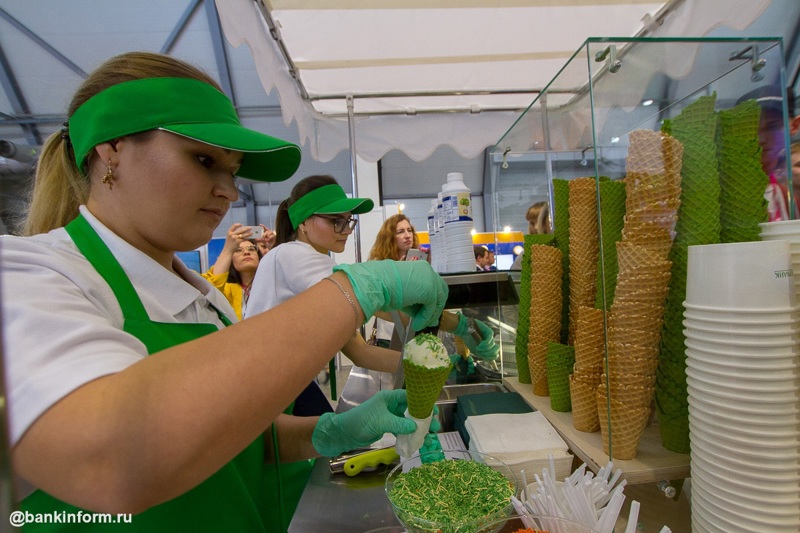Ну а за то, чтобы гостям сбербанковского стенда было не только интересно, но и вкусно, отвечает миниатюрное кафе-мороженое. Весьма актуальное угощение в столь жаркое (в прямом и переносном смысле) время.