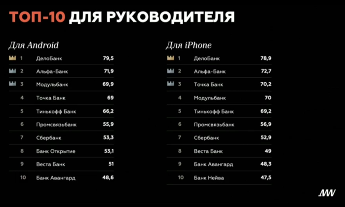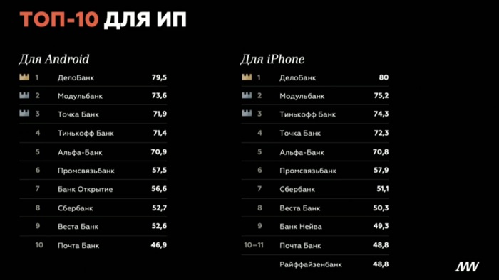 Ниже в скриншотах с презентации можно посмотреть ТОП-10 лучших мобильных банков для бизнеса по версии Markswebb.