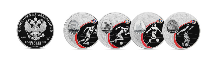 Первая партия «футбольных» монет появилась в конце 2016 года. городскую серию открыл Екатеринбург, также тогда появились монеты, посвященные Саранску, Казани и Калининграду. Всего в серии выйдет тринадцать монет. Одиннадцать будут представлять города, принимающие матчи (а изображенные на них футболисты будут составлять полную команду). Дизайн еще двух монет ЦБ держит в секрете, известно лишь, что одна из них будет не серебряной, а золотой. Но резонно предположить, что это будут две монеты с одинаковым дизайном, представляющим либо совокупность одиннадцати городов, либо Россию в целом.