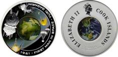 На островах Кука увековечили обоих космических первопроходцев. В данном наборе особо интересен аверс, где с обязательным профилем английской королевы соседствует цветное изображение нашей планеты. А еще интереснее то, что основную часть монеты можно крутить вокруг этой маленькой «Земли».