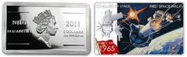 Юрий Алексеевич узнаваем и на малавийской монетке 2011 года. А вот красочная прямоугольная монета из Ниуэ того же года - «Первый человек в космосе». По названию можно подумать, что это опять про Гагарина, но нет - новозеландцы подразумевали открытый космос и Алексея Леонова.