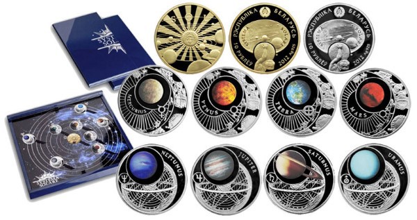 Ну а закончим обзор великолепным белорусским набором цветных серебряных монет «Солнечная система» - непосредственного отношения к космонавтике он не имеет, но не упомянуть его совершенно невозможно.
