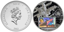 На монете из Ниуэ «Полет к звездам» аверс вполне обычный и ничего не крутится, зато на другой стороне на фоне космического пейзажа расположено голографическое изображение советской марки, выпущенной в честь первого космического полета. Такое вот совмещение нумизматики с филателией.