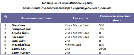 Существенно разнится и стоимость эмиссии таких карт (это хорошо видно из приведенной таблицы). Тут имеется два варианта. Банк может взять за оформление «индивидуального» пластика некую сумму, а потом обслуживать его по стандартному тарифу. А может сделать такую карту бесплатно, но тогда ее обслуживание будет дороже, чем у обычного, «массового» пластика.
