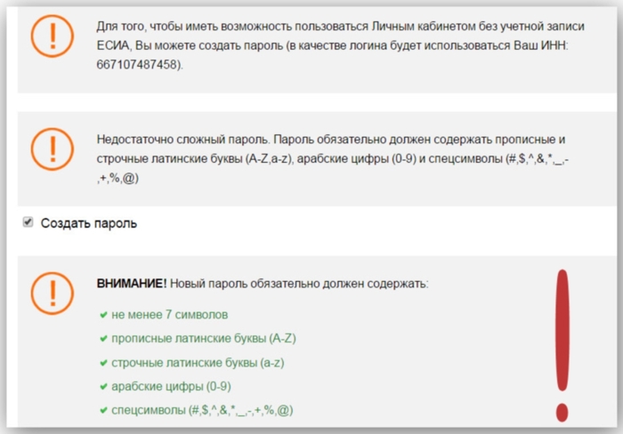 Для получения постоянного доступа к ЛКН создаем пароль в соответствии с инструкцией. Кстати, пароль получится в итоге нестандартный, так как будет содержать символы, которые обычно не допускаются в формировании шифра. Могут возникнуть трудности с его запоминанием. Логином будет ваш ИНН.