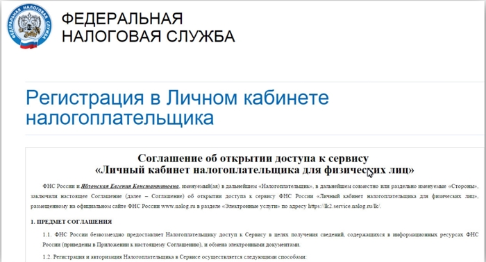 Подтверждаем галочкой «Соглашение об открытии доступа к сервису «в Личном кабинете налогоплательщика для физических лиц»».