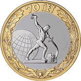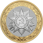 Непосредственно к 70-летию Победы Банк России выпустил три биметаллических десятки - «Орден Отечественной войны», «Воин-освободитель» и «Перекуем мечи на орала» (неофиициальные названия). На двух последних изображены скульптуры, созданные Евгением Вучетичем в Берлине и Нью-Йорке.
