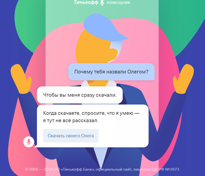 Олег будет постепенно появляться у пользователей мобильного приложения «Тинькофф» на базе iOs (не у всех сразу), чуть позже - у владельцев Android. Он призван упростить использование широкого спектра услуг экосистемы «Тинькофф», финансовых и нефинансовых. Сейчас Олег может провести денежный перевод, управлять картами, консультировать по некоторым продуктам (в с ложных случаях переводя на живого консультанта из колл-центра), а также бронировать столики в ресторанах, покупать билеты в кино и искать товары по оптимальным ценам.