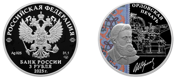 рельефное изображение портрета И.И. Орлова на фоне выполненного в технике лазерного матирования изображения чертежа печатного станка, созданного Орловым, и цветного орнаментального покрытия, имитирующего орловскую печать; справа вверху в две строки – надпись «ОРЛОВСКАЯ ПЕЧАТЬ», внизу – факсимиле подписи И.И. Орлова.