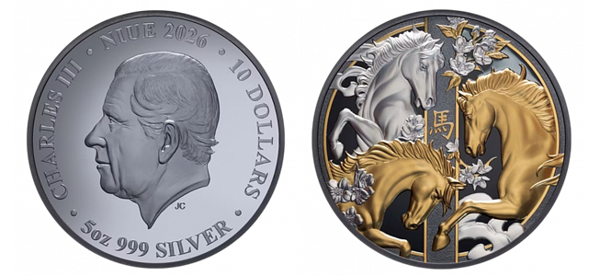 Аверс: изображен портрет короля Карла III (внизу портрета инициалы дизайнера "JC"), надпись "CHARLES III", название страны-эмитента "NIUE", год выпуска "2026", номинал "10 DOLLARS", вес "5 oz", проба "999" и металл "SILVER".