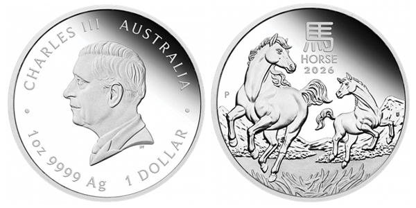 Реверс: изображены скачущие галопом Лошадь и жеребёнок на фоне гор и травянистых равнин. На монете размещена надпись "HORSE 2026", китайский иероглиф "лошадь", а также знак монетного двора Перта - "P".