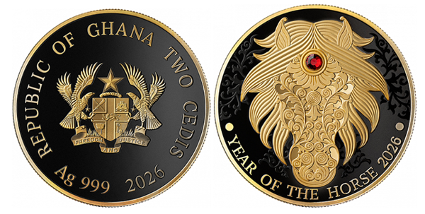 Аверс: изображена Государственная печать Ганы и надписи: "REPUBLIC OF GHANA" – страна-эмитент, "TWO CEDIS" – номинал, "2026" – год выпуска и "Ag 999" – проба Серебра.