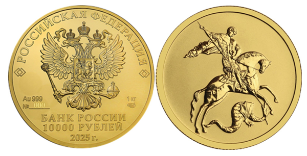 Аверс: в центре - рельефное изображение Государственного герба Российской Федерации, вверху вдоль канта надпись: РОССИЙСКАЯ ФЕДЕРАЦИЯ, обрамленная с обеих сторон сдвоенными ромбами, внизу под гербом надпись: Au 999 № 1 КГ СПМД (вес и проба золота, порядковый номер монеты, монограмма монетного двора), ниже надпись в три строки: БАНК РОССИИ 10000 РУБЛЕЙ 2025 г. (банк, номинал, год чеканки).