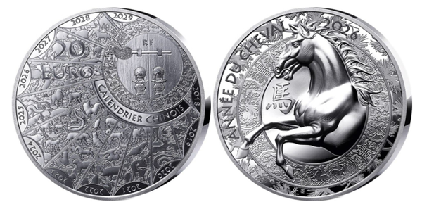 Аверс: вверху справа изображен круг, дверь храма с декоративными ручками с надписью: RF (Republique Francaise) - Французская Республика. Он окружен декоративным кольцом, под ним лента с надписью: CALENDRIER CHINOIS (Китайский календарь). Вверху слева надпись: 20 EURO (номинал). На остальной части двенадцать секторов лунного цикла с годом возле канта с изображением соответствующих животных (2018, 2019, 2020, 2021, 2022, 2023, 2024, 2025, 2026, 2027, 2028, 2029).
