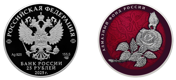 Аверс: рельефное изображение Государственного герба Российской Федерации, над ним вдоль канта – надпись полукругом «РОССИЙСКАЯ ФЕДЕРАЦИЯ», обрамленная с обеих сторон сдвоенными ромбами, под гербом слева – обозначения драгоценного металла и пробы сплава, справа – содержание химически чистого металла и товарный знак монетного двора, внизу в центре в три строки – надпись «БАНК РОССИИ», номинал монеты «25 РУБЛЕЙ», год выпуска «2025 г.».p>