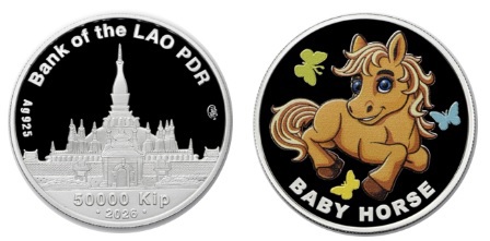 Аверс: в центре – рельефное изображение национального символа Лаоса, храма Тхат-Луанг, над ним надпись – «Bank of the LAO PDR», в нижней части номинал «50 000 Kip» и год «2026», слева и справа от изображения храма расположены товарный знак монетного двора, обозначение и проба драгоценного металла.