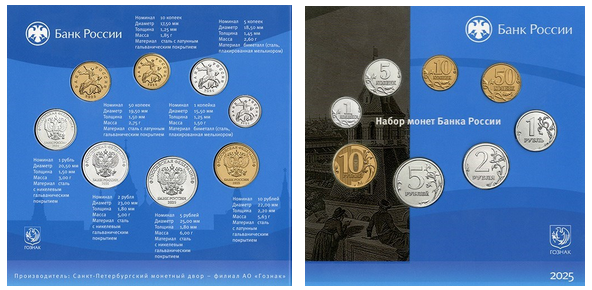 – монеты номиналом 1, 5, 10 и 50 копеек расположено рельефное изображение Георгия Победоносца верхом на коне, поражающего копьем змея, по окружности – надпись «БАНК РОССИИ» и год выпуска «2025», справа – буквы С-П (Санкт-Петербург), обозначающие монетный двор – изготовитель;
