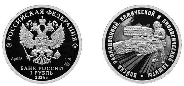 Продается в комплекте из трёх монет серии «Войска радиационной, химической и биологической защиты». Аверс: рельефное изображение Государственного герба Российской Федерации, над ним вдоль канта – надпись полукругом «РОССИЙСКАЯ ФЕДЕРАЦИЯ», обрамленная с обеих сторон сдвоенными ромбами, под гербом слева – обозначения драгоценного металла и пробы сплава, справа – содержание химически чистого металла и товарный знак монетного двора, внизу в центре в три строки – надпись «БАНК РОССИИ», номинал монеты «1 РУБЛЬ», год выпуска «2026 г.».